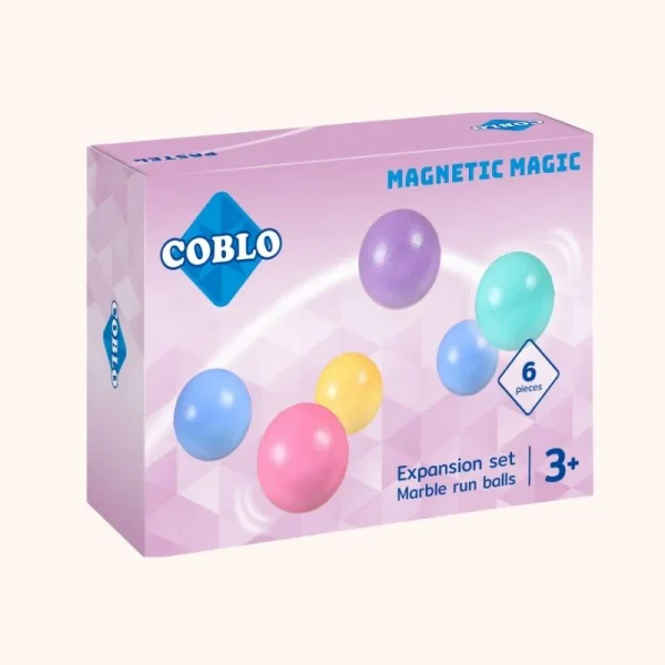 De Coblo knikkerbaan ballen pastel – 6 stuks zijn een fijne aanvulling voor kinderen die graag spelen met een magnetische knikkerbaan. Van extra balletjes kun je er eigenlijk nooit genoeg hebben, want hoe meer knikkers er tegelijk door de baan rollen, hoe leuker het spel wordt. Kinderen kijken hun ogen uit wanneer de ballen naar beneden draaien, langs bochten schieten en elkaar onderweg achtervolgen.