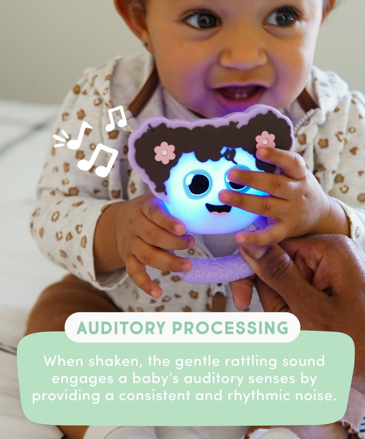 Bij elke beweging begint de rammelaar te gloeien in 7 heldere kleuren, waardoor je kindje direct visuele feedback krijgt. De zachte texturen en het goed vast te houden handvat stimuleren de fijne motoriek en maken het makkelijk om te grijpen, schudden en bewegen.
