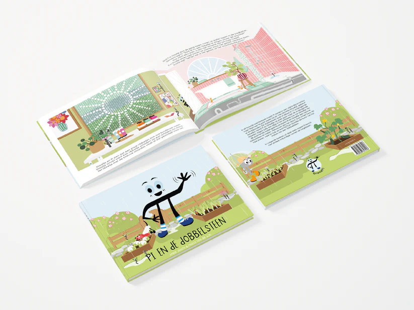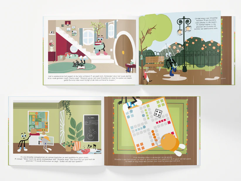In “Pi en de dobbelsteen” van GrandPi gaan Pi en zijn vriendinnetje Straaltje opnieuw op avontuur. Wanneer ze samen spelen, spat de dobbelsteen plotseling uit elkaar in twaalf ondeugende ribbetjes. Terwijl ze de ribbetjes achterna gaan, krijgen lezers een kijkje in het creatieve en kleurrijke huis van Straaltje.
