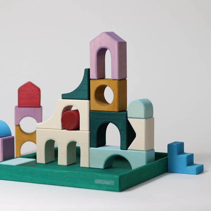 Hoewel deze set een duidelijke architectonische uitstraling heeft, ligt het spel niet vast. Juist doordat de vormen open gebruikt kunnen worden, blijft er veel ruimte voor eigen ideeën. Een trap hoeft geen trap te zijn, een poort kan ook een raam, tunnel of decorstuk worden.