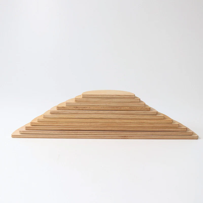 De Grimm’s Grote Halve Schijven – Naturel is een bijzondere grote bouw- en puzzelset voor spel op de vloer. De 11 halve schijven van naturel hout nodigen uit tot bouwen, schuiven, combineren en creëren op een grotere schaal.