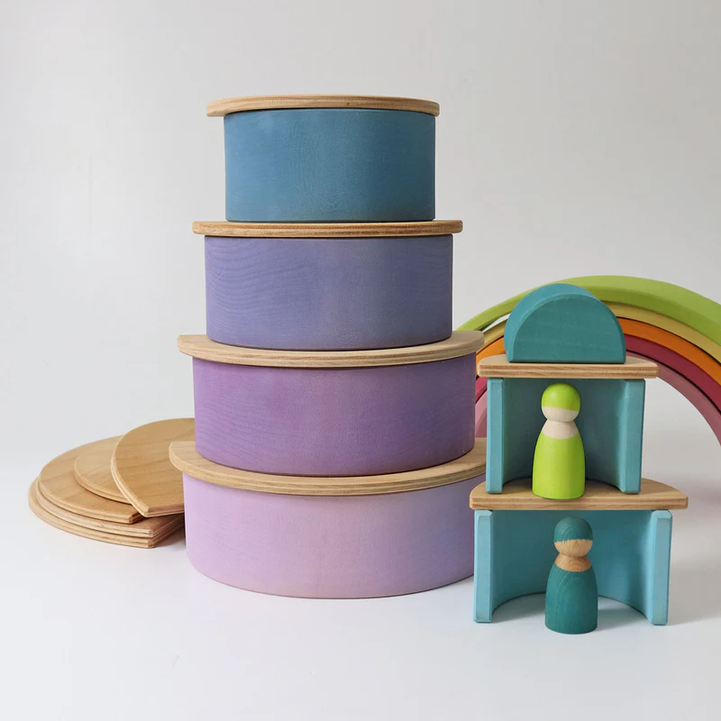 In combinatie met andere Grimm’s materialen, zoals stapeltunnels of bouwblokken, ontstaan er prachtige mogelijkheden voor fantasierijke poppenhuizen en open werelden. Juist doordat de halve schijven groot en stevig zijn, kunnen kinderen echt spelen met indeling, verdiepingen en moderne vormen.