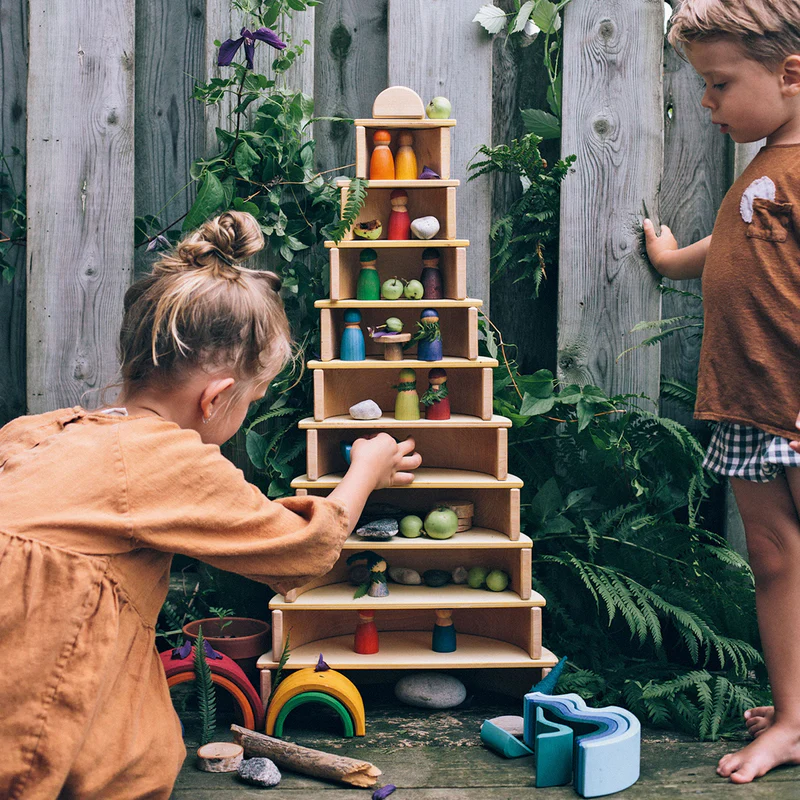 De naturel uitvoering geeft deze set een rustige, warme uitstraling. De vormen spreken voor zich en laten veel ruimte voor eigen invulling in het spel. Door het hout niet fel te kleuren, blijft de aandacht volledig bij de vorm, de compositie en wat het kind ermee maakt.