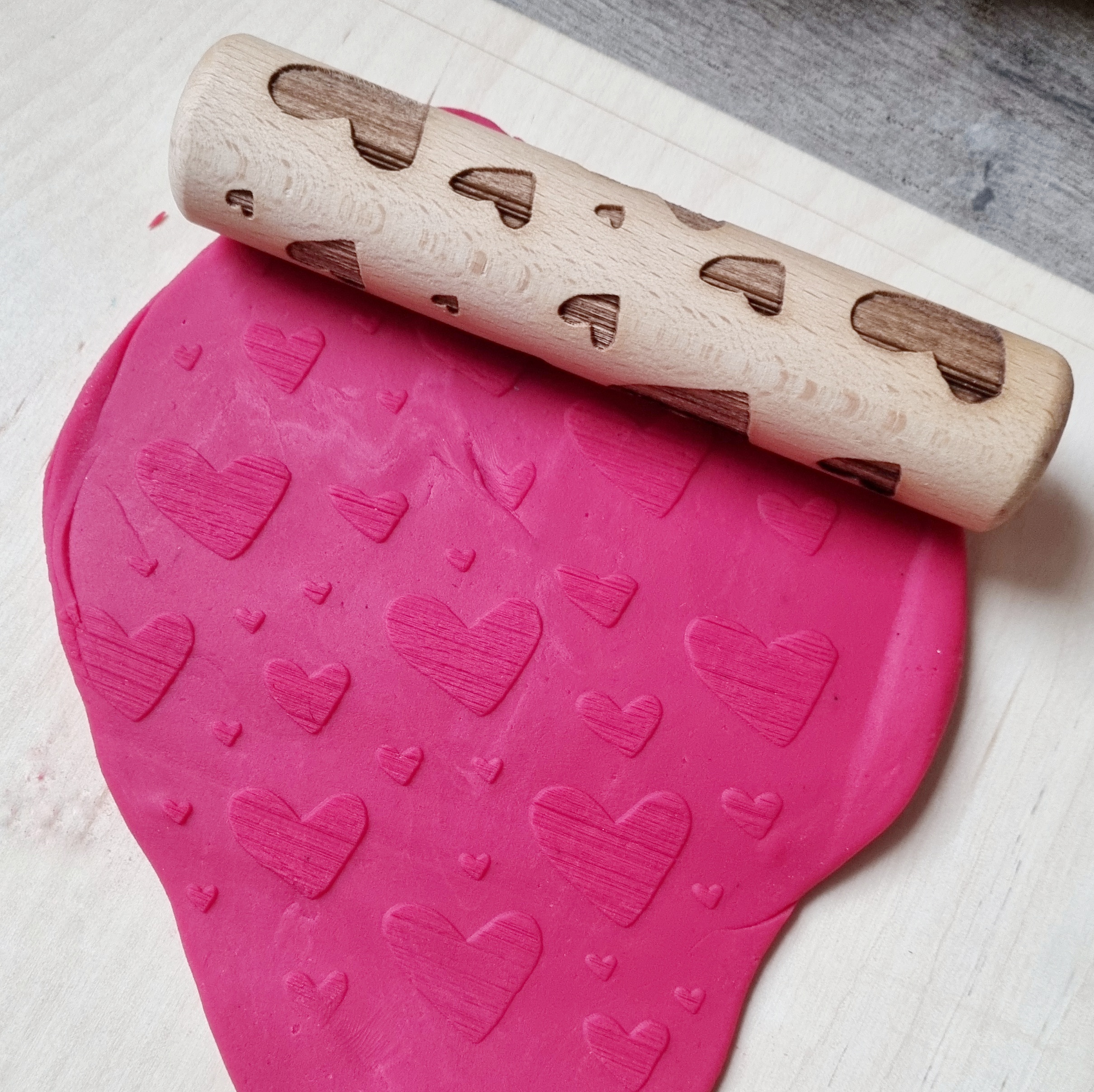 Wanneer er klei/deeg in de roller blijft zitten kan deze verwijderd worden met een beetje water en een oude (tanden-)borstel. En/of gebruik een beetje maïzena/talkpoeder op de roller zodat er minder klei in blijft kleven.