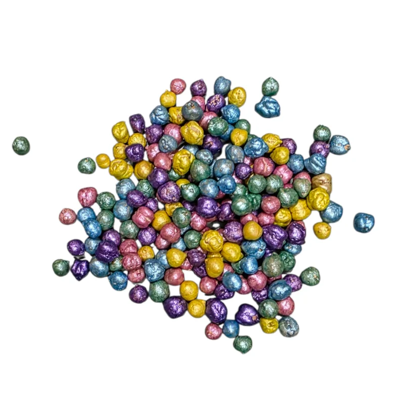 De gekleurde kikkererwten worden met zorg geverfd. Omdat het een natuurlijk materiaal is, kan de originele kleur hier en daar subtiel zichtbaar zijn.