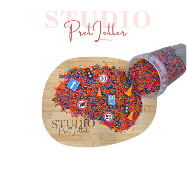 Met de Studio Pretletter PLA Figuurtjes – Verkeer bouw je eenvoudig een eigen wegennet in de sensorische speelbak. De set bevat herkenbare verkeersitems zoals snelheidsborden, verkeerslichten en pionnen, ideaal voor themaspel rondom voertuigen en bouwen.