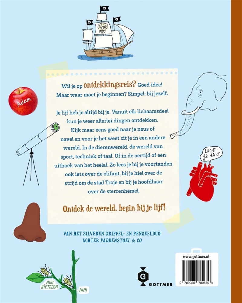 Wil je de wereld ontdekken? Goed idee! Maar waar moet je beginnen? Dat is simpel: bij jezelf. Bij je eigen lijf. Dichterbij kan niet. En je hoeft niet te zoeken, want je lichaam heb je altijd bij je. Je lijf is razend interessant. Elk lichaamsdeel heeft zijn eigen verhalen en die staan in dit boek. Je leest waar het lichaamsdeel zit. Hoe het eruitziet. Hoe het werkt. Dat soort dingen. Een boek over het menselijk lichaam dus? Ja en nee. Dit boek doet namelijk iets wat in andere informatieve boeken verboden is: afdwalen. Meestal maar één stap, maar dat is al genoeg om in een andere wereld te zitten. In de dierenwereld bijvoorbeeld. Of in de wereld van de sport, techniek of taal. Of in een andere tijd, want dit boek gaat ook over geschiedenis. En zelfs over het heelal. Maar het begint dus steeds bij jezelf.